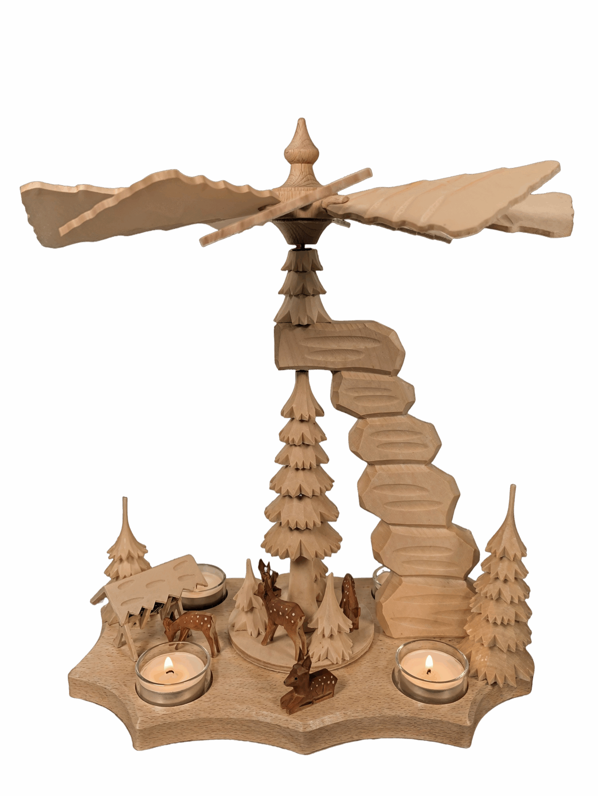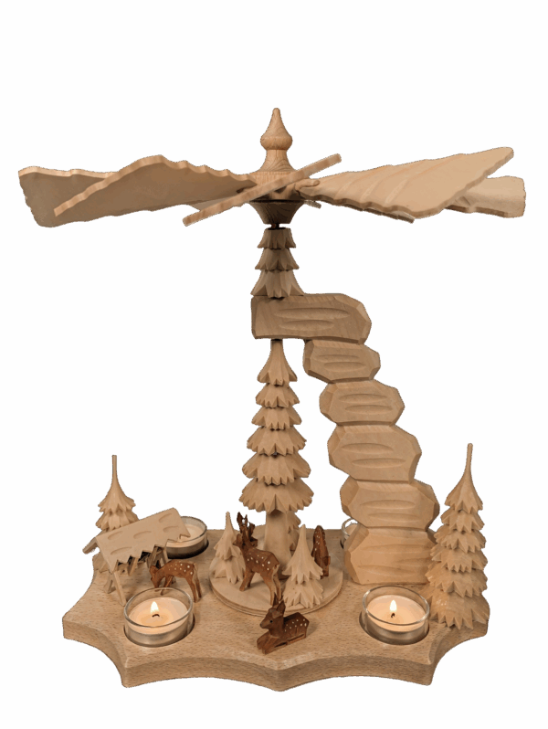 Diese ist bestückt mit geschnitzten Rehen, Bäumen und einer Futterkrippe.