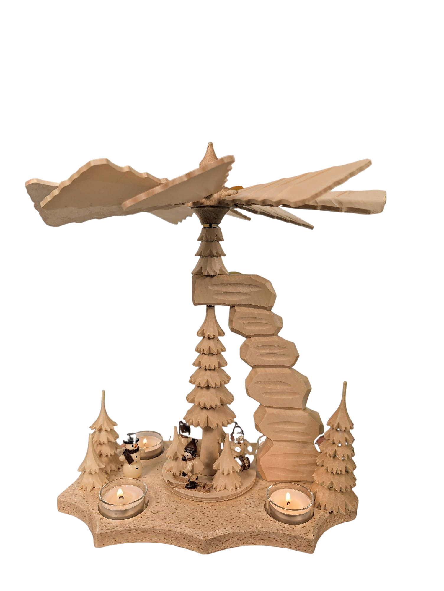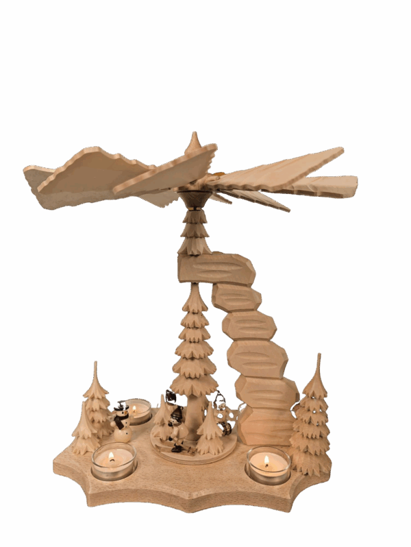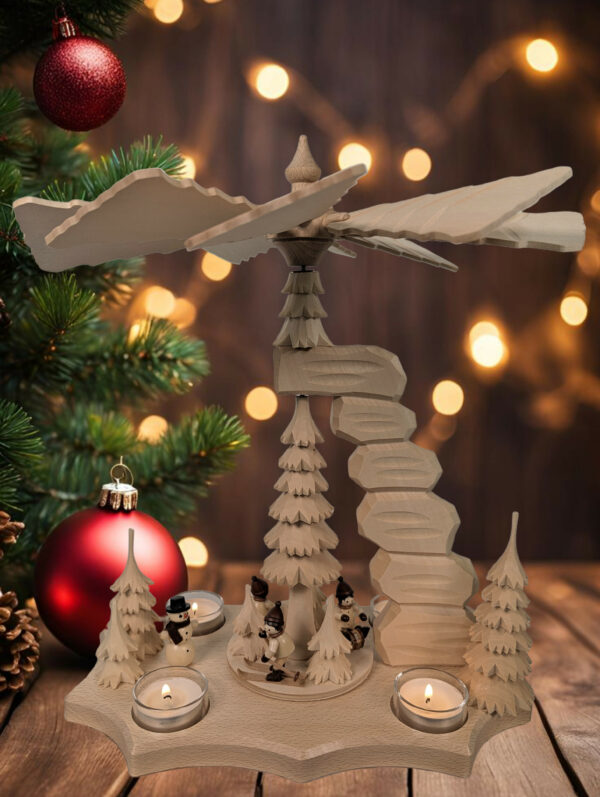 Diese ist bestückt mit gedrechselten Winterkinderfiguren und Schneemann von Romy Thiel und geschnitzten Bäumen.